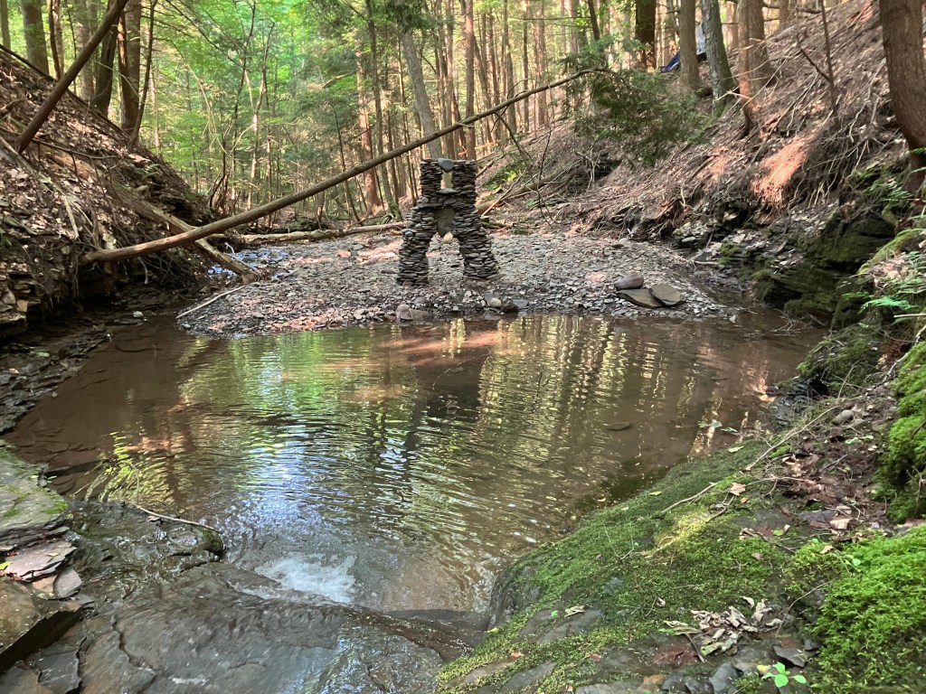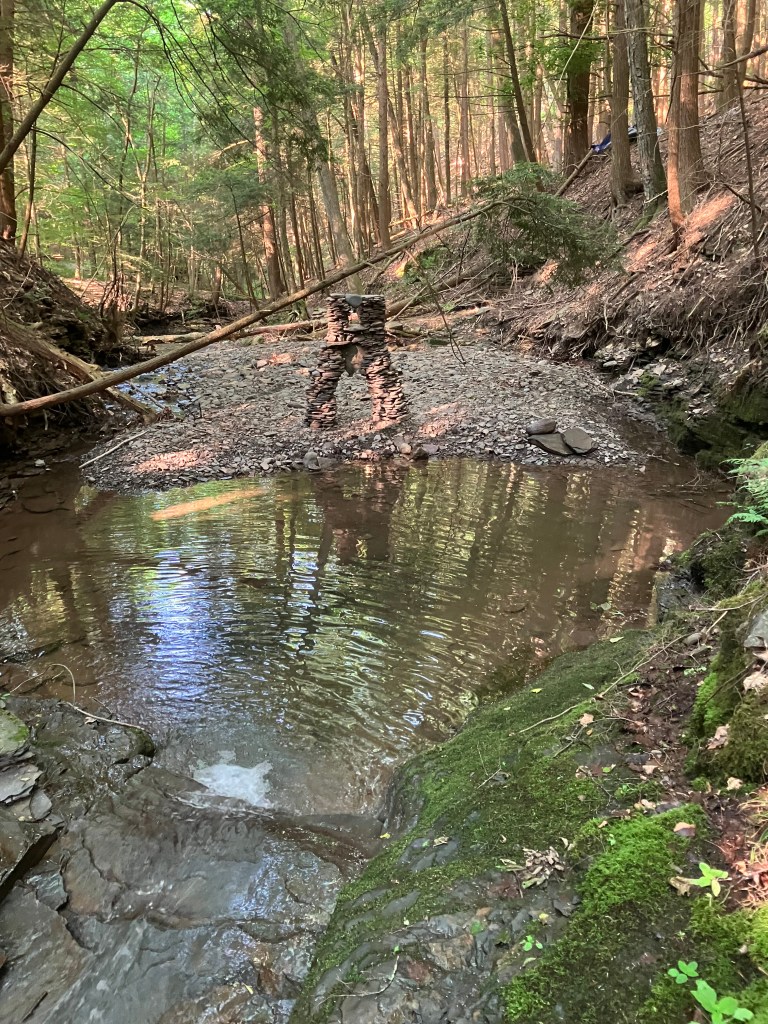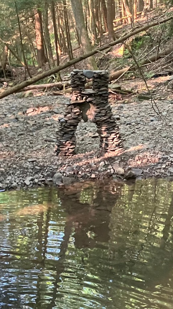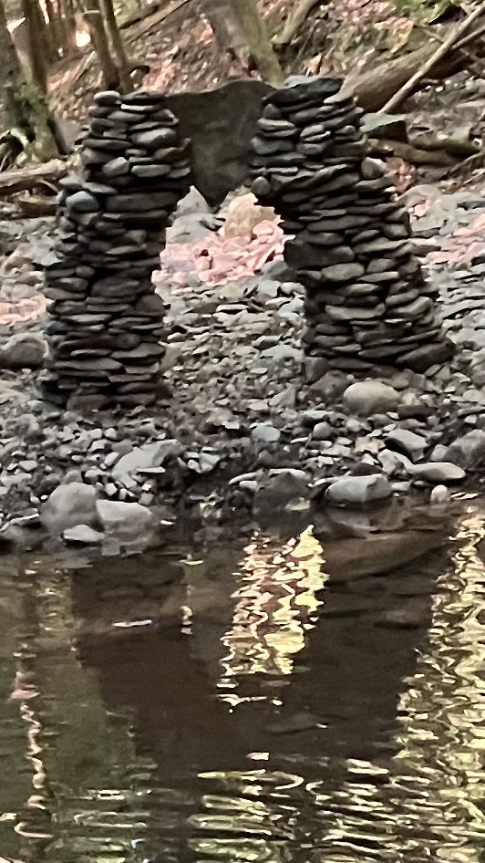 After walking round a few bends in the meandering creek, I reach my special spot. It’s a hidden little pool with a small waterfall on one side and a rocky shoreline on the other. This is where I perform my sacred ritual. Engage in my unique form of nature worship. Do what I love. There is an incredible variety of rock shapes and sizes to work with and everything I make here will be temporary. Every few months, the creek overflows in a big rain and thereby knocks over any of my creations that are on this shoreline. Indeed, there was recently a rather big flood that destroyed my most recent effort so this Father’s Day morning, I have a blank shoreline space upon which to create. The trees are blocking all the sunlight but the small waterfall is the perfect background. What shall I make today?
