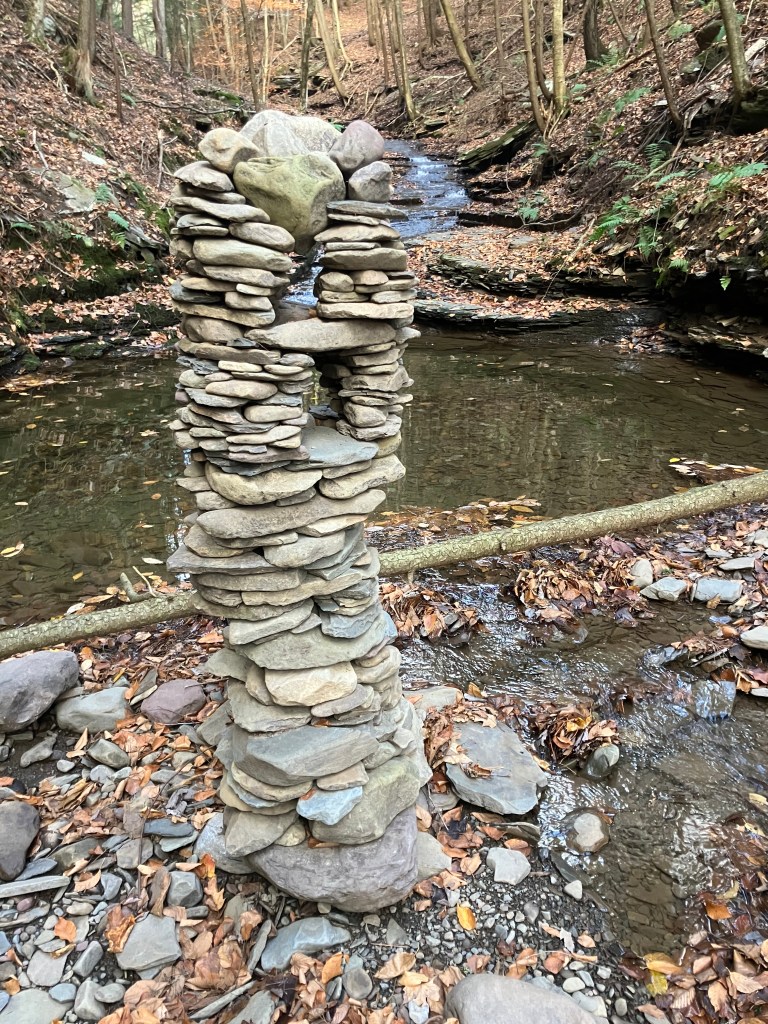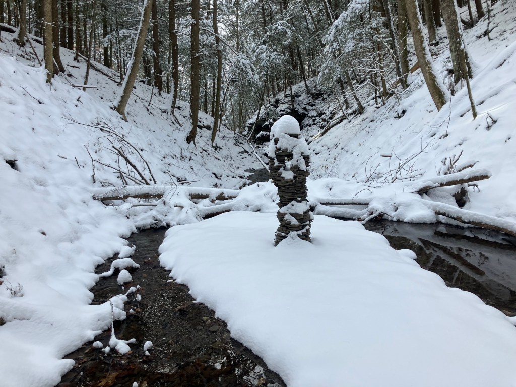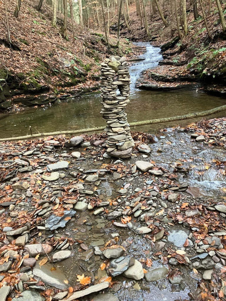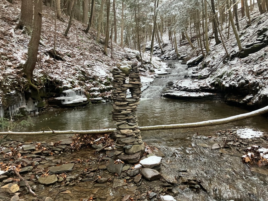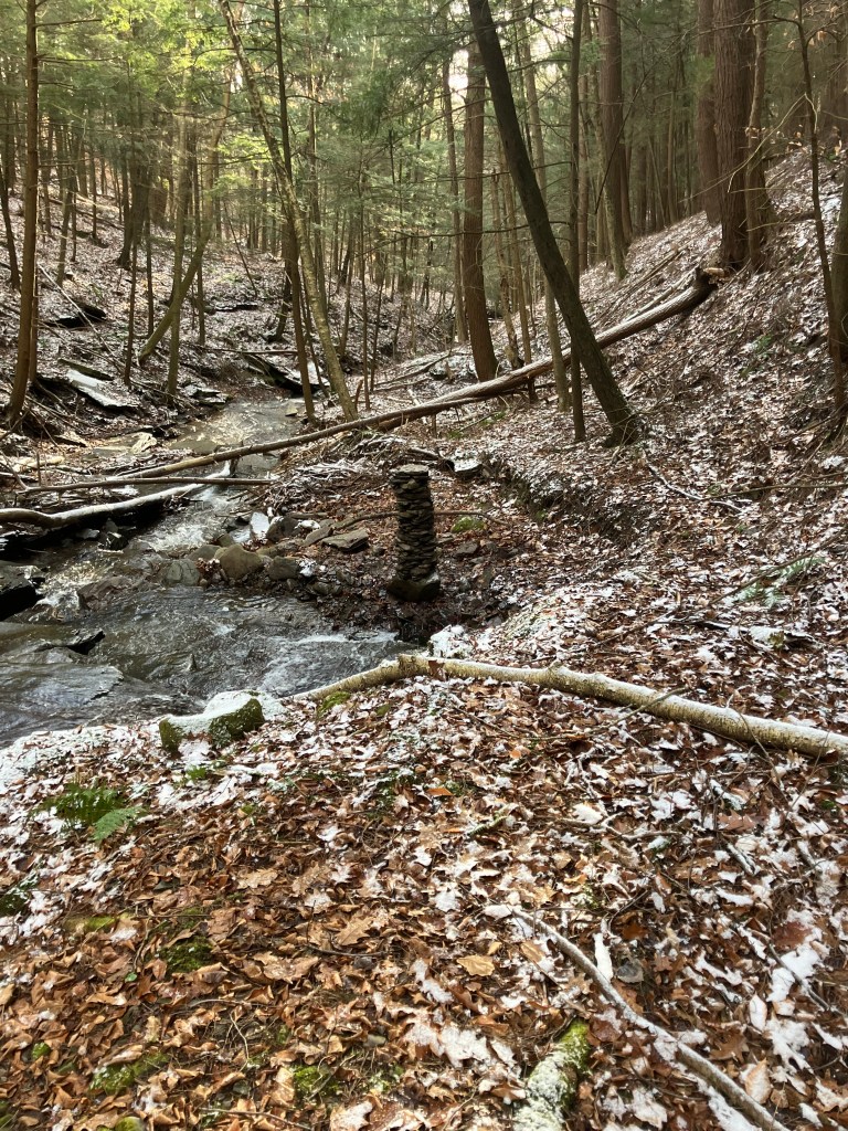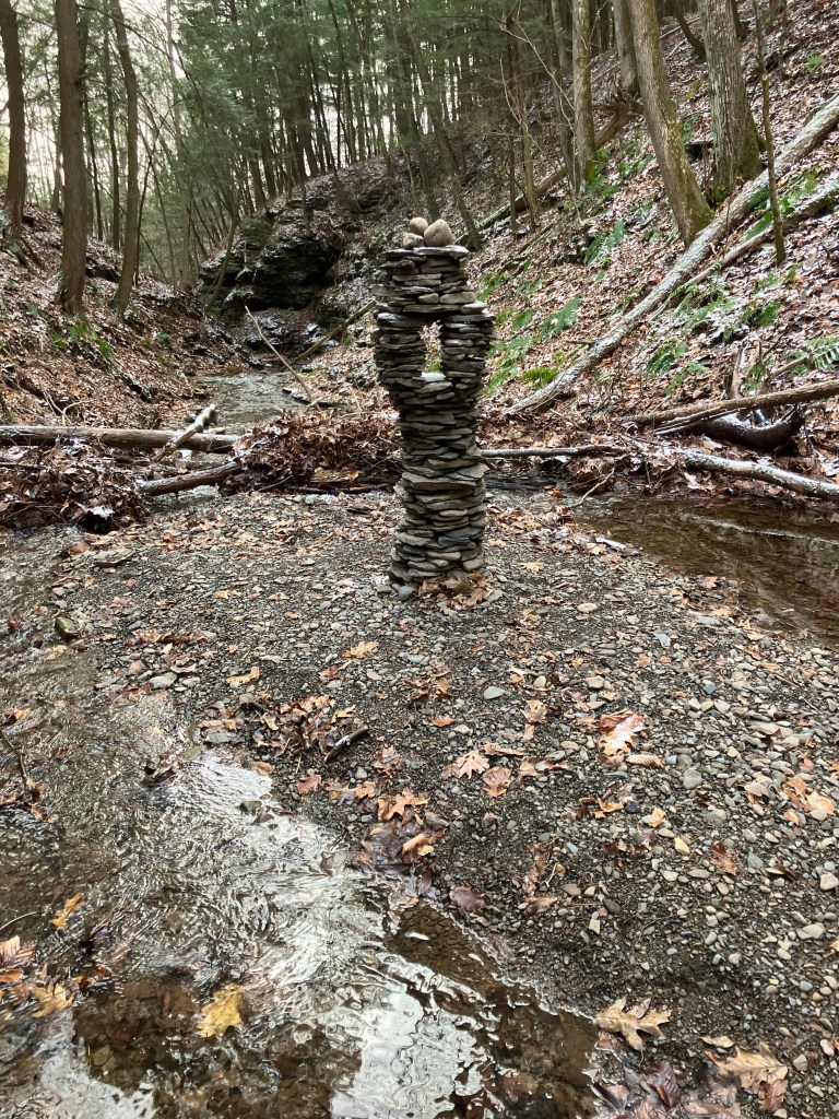 The third amigo in the group is also known as the waterfall guardian because he is located in a wonderful little spot. I have a long standing belief that sticking your head in a woodland waterfall is a sacred act that helps you stay young. And this particular waterfall upon this particular creek is perfectly situated for that kind of activity. I stick my head beneath it frequently. I’ve only built a tower here once before, during a drought there was hardly any water in the creek at all. I built a little tower to ask the gods to send rain. That tower got washed away when the rains did come and the creek overflowed. This new guy was completed on November 28, 2025. He is third amigo because he is the third immigrant you come across if you happen to be walking up this particular creek. It was still standing in January 2026. Watch this site to see if it stays standing through Spring.