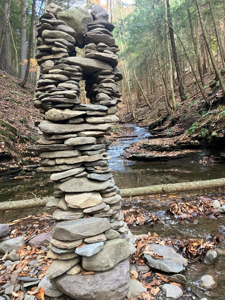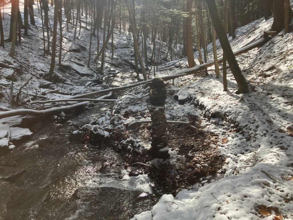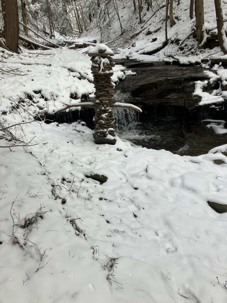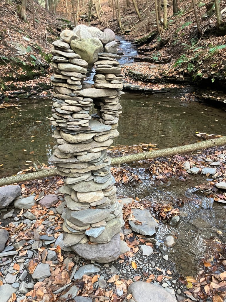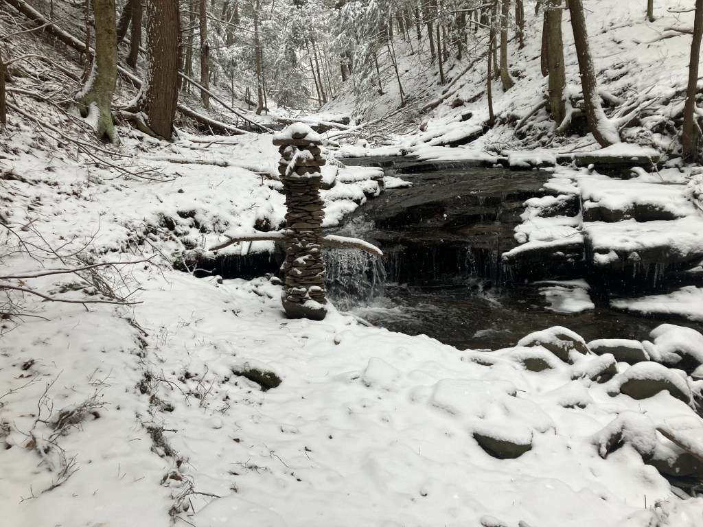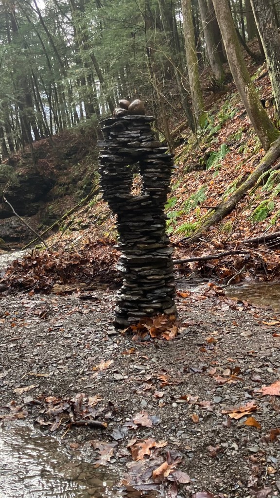 The third amigo in the group is also known as the waterfall guardian because he is located in a wonderful little spot. I have a long standing belief that sticking your head in a woodland waterfall is a sacred act that helps you stay young. And this particular waterfall upon this particular creek is perfectly situated for that kind of activity. I stick my head beneath it frequently. I’ve only built a tower here once before, during a drought there was hardly any water in the creek at all. I built a little tower to ask the gods to send rain. That tower got washed away when the rains did come and the creek overflowed. This new guy was completed on November 28, 2025. He is third amigo because he is the third immigrant you come across if you happen to be walking up this particular creek. It was still standing in January 2026. Watch this site to see if it stays standing through Spring.