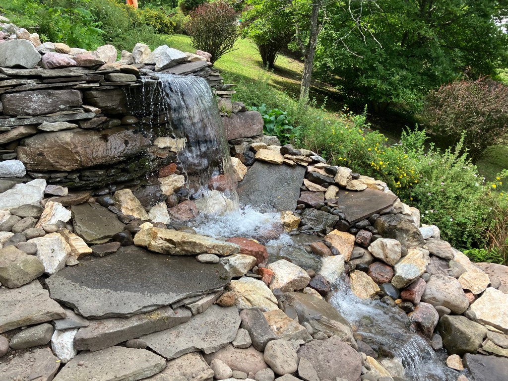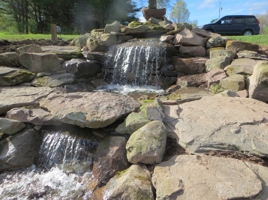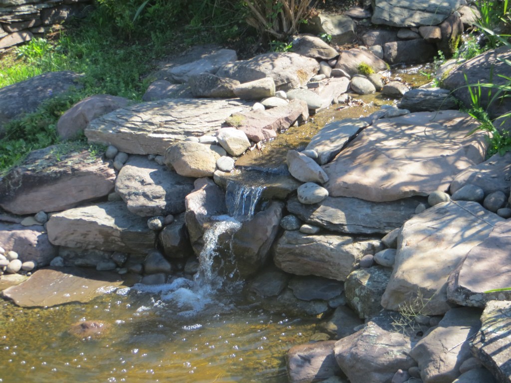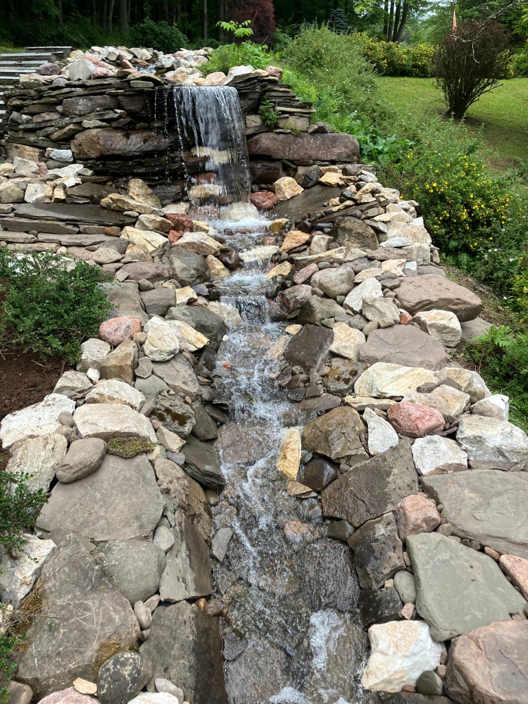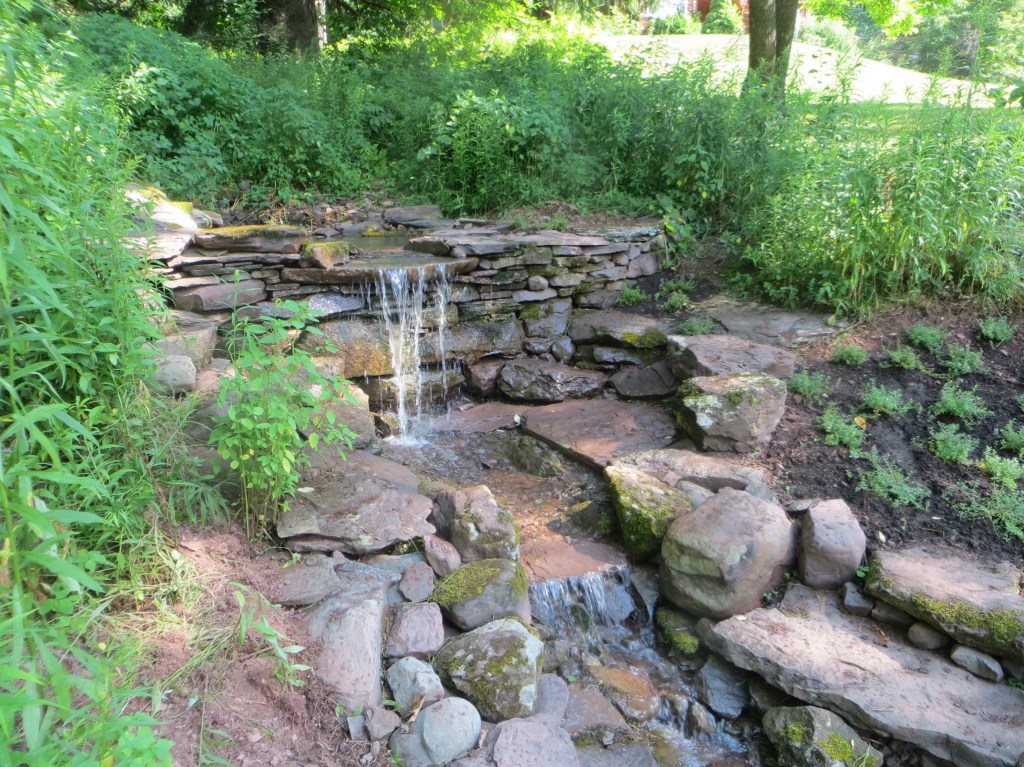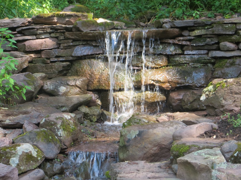 Sometime around the turn of the century, I started making waterfalls. Big waterfalls and small waterfalls and several sizes in between. There is something philosophically profound about the process and the stonework is fun. But there is also something that is slightly problematic. I’m not really fond of the necessary mechanical accessories and all the product purchasing requirements (pumps, filters, liners, lights, fountains, doodads and whathaveyous).